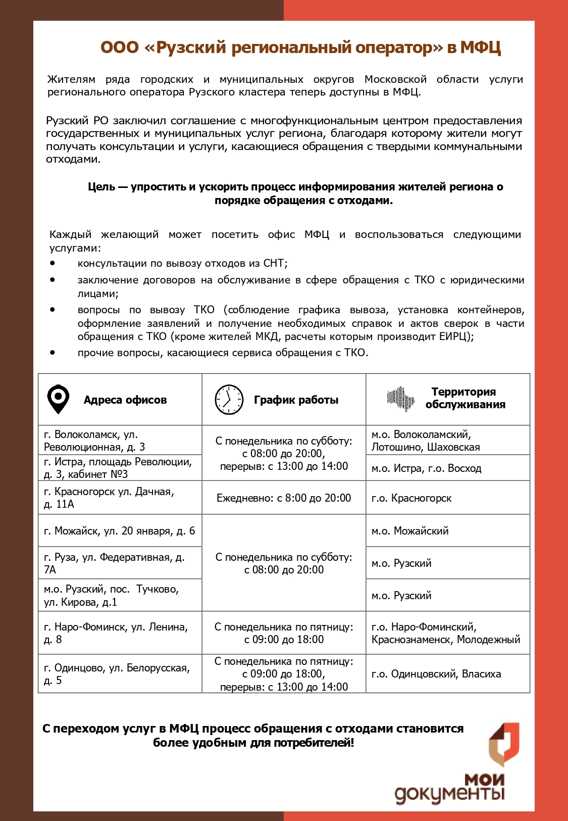 МФЦ "Мои документы" в г. Руза; м.о. Рузский; г. Руза, ул. Федеративная, д.7а;С понедельника по субботу с 08:00 до 20:00 без перерыва;